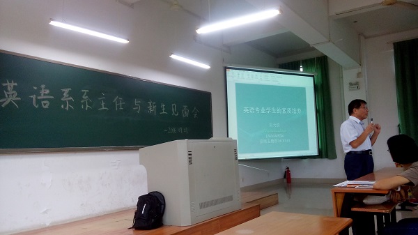 9月27日下午14:30,英语系在主2#310教室召开英语系系主任与2016级新生见面交流会,英语系主任雷天放教授给113名英语系新生做了一场生动丰富的演讲。与会的还有英语系辅导员陈毓榕、赵树元,教学秘书余妙肖三位老师。