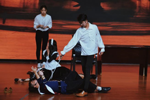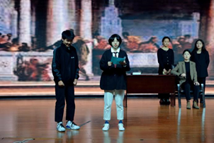 剧目《李尔王》当中,同学们逼真的服饰与出色的表演,将一个昏庸的国王与他的三个女儿之间的故事完整地演绎出来。一次错误的抉择,使李尔王悔恨终生。仔细回味思索,我们面对人生的各种抉择似乎有了更深刻的认识。