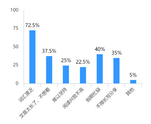 通过数据发现,同学们在阅读过程中遇到的最大问题就是词汇不足,占比72.5%;其次就是寒假期间较为忙碌,占比40%;再者就是认为文章太长,占比37.5%。除这些问题以外,同学们遇到的问题还有不擅长写英文分享,难以坚持,阅读兴致不高等。(文末附问卷星具体链接)