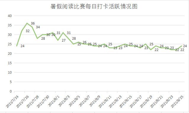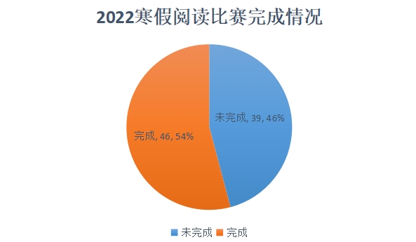 此次寒假阅读比赛开始于1月10日,结束于2月18日,共计40天。在此次比赛中,初期参赛人员共有85人,后期由于长期未打卡而退出的人数共有39人,最终剩余坚持打卡人数46人,完成比率为54.12%。与2021年暑假比赛完成率60%相比,下降了大约6%;而相较于2021寒假比赛完成率70%,下降了大约16%。