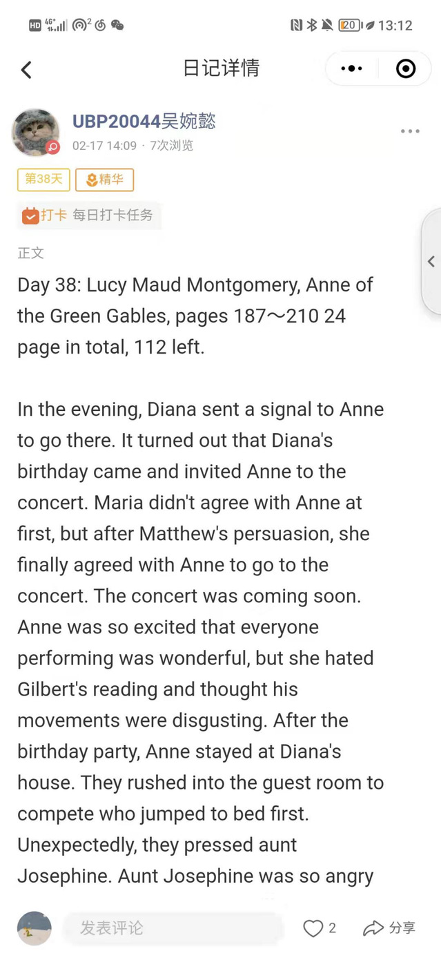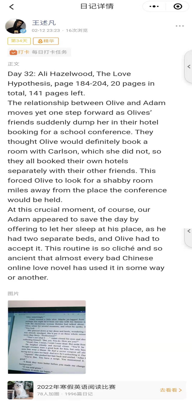 关于这次阅读比赛,很高兴自己坚持下来,最开始参加比赛的初衷就是想增加自己的英语文章阅读量,让自己的整个假期丰富起来。每日打开书本,成为了我假期必不可少的步骤、假期也变得丰富多彩。都说“书中自有黄金屋、颜如玉”。确实如此,一本本英语原著读完确实与译本或翻拍的电影、电视剧不一样,自己所阅读的“黄金屋”“颜如玉”一定与他人的会有所不同。希望之后自己也能坚持每日阅读的习惯。找到除“黄金屋、颜如玉”外的另一番天地。