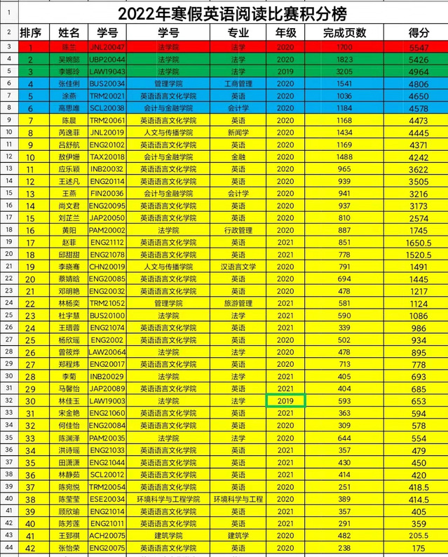 这说明了本次寒假阅读比赛的坚持下来的参赛者的阅读量和努力程度都有了非常显著的提升。另外,有不少阅读页数较多的同学来自于其他专业,且是第一次参加阅读比赛,这表明了非英专生阅读能力也毫不逊色。