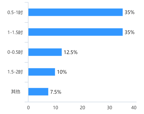 0-0.5时的共计5人,占12.5%;0.5-1时的共计14人,占35%;1-1.5时的共计14人,占35%;1.5-2时的共计4人,占10%;3时以上的共计3人,占7.5%。有阅读时间较长同学表示,由于寒假在家闲暇时间较多,所以每日花在阅读的时间上较多;也有同学表示,每日的阅读时长会根据实际状况调整,若空闲时,便会读得久些。