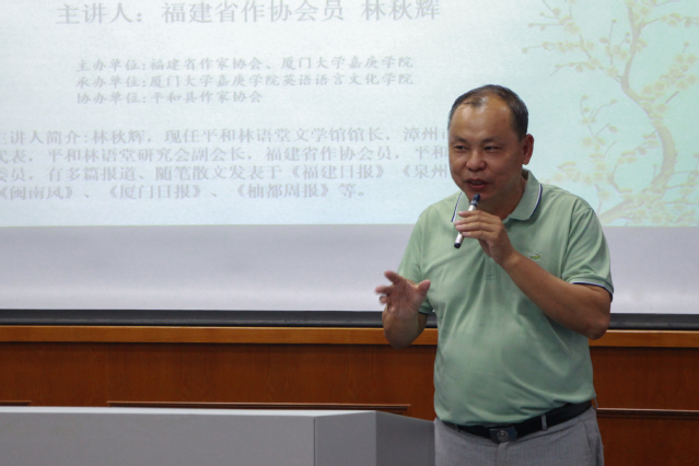 在林秋辉先生的讲座中,师生们了解到林语堂先生是从平和山乡走向世界的文学大师,是中西文化交流的使者。林语堂在旅居国外三十年间,出版了三十多部英文版的作品,向世界解说中国,向祖国表达赤诚。他是第一位以英文书写扬名海外的中国作家,也是集语言学家、哲学家、文学家于一身的著名学者。他的《吾国与吾民》、《生活的艺术》、《浮生六记》、《京华烟云》、《风声鹤唳》、《老子的智慧》和《武则天传》等英文原版著作对中西文化交流做出了巨大贡献。他的长篇小说《京华烟云》(Moment in Peking)使他五次获诺贝尔文学奖提名。林语堂对自己的评价是“两脚跨东西文化,一心评宇宙文章”。