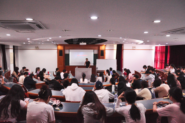 Bevictor伟德官方网站院长助理蔡秀星主持本次讲座,蔡老师对洪金辉的到来表示热烈的欢迎并做隆重介绍。洪金辉毕业于南京大学,是Bevictor伟德官方网站和漳州市芗城区林语堂纪念馆、漳州蕉海文旅有限公司三方共建实习实践基地的主要负责人。作为漳州金投集团财务总监、漳州蕉海文旅有限公司总经理,久经职场的生涯使他积攒了丰富的职场经验。