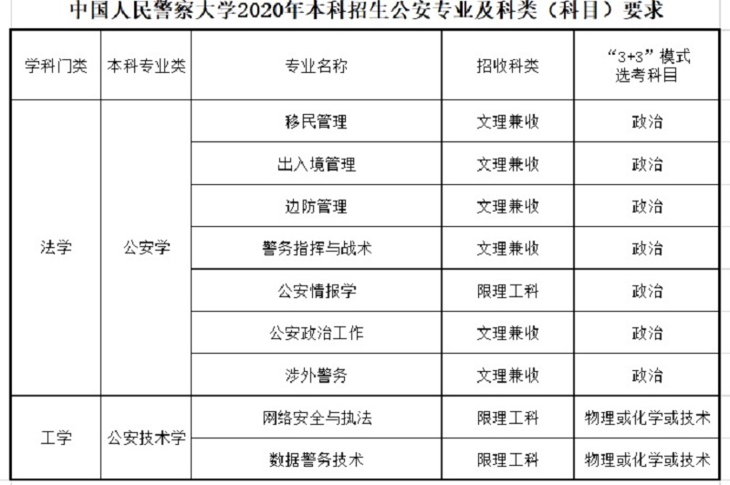 根据教育部《普通高等学校本科招生专业选考科目要求指引(试行)》的文件精神,经警察大学研究决定并报教育部及相关省份教育考试主管机构同意,对在2020年进行高考综合改革试点省份(其包括北京、天津、上海、浙江、山东、海南等6个省市)的考生提出高中学业水平考试科目报考要求。以上6个省市“3+3模式”的考生2020年报考我校相关专业的,均须执行学校公布的选考科目要求。