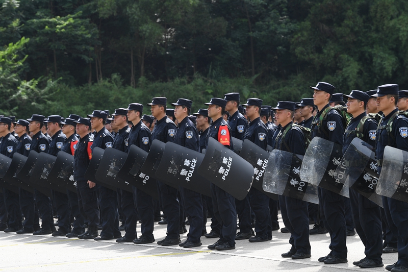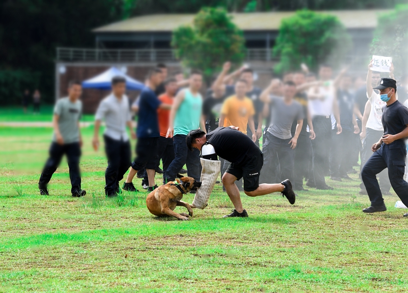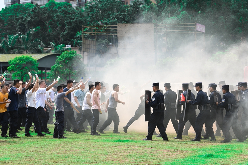 上午9时,伴随着紧急集合号,798名参训学员齐装满员仅用2分钟15秒即从宿舍到综合训练场集合完毕。刘金广主任以指挥长的身份立即宣布情况、下达开进命令和战前动员,14个学员分队闻令而动,边蹬车边穿戴防护服,边开进边补充任务。在处突阶段,演练以广东省南部地区新一轮疫情背景下,紧急拉动处置口岸突发事件为基本想定。首先在模拟边检大厅处置了扰乱秩序和“政治快闪”事件,紧接着在广州市公安局无人机中队和警犬中队配合下,各学员分队密切协同处置了口岸群体性突发事件。随后演练队伍迅速集结,刘金广主任以总导演的身份作了演练讲评,对参训学员表现出的战斗作风和学习态度给予充分肯定,同时针对演练中暴露出来的问题,要求学员进一步加快警察身份转变,不断增强法律意识,灵活运用战术战法,切实提升实战本领,并感谢局领导和机关给了校区和学员在实战训练中学习提高的机会。