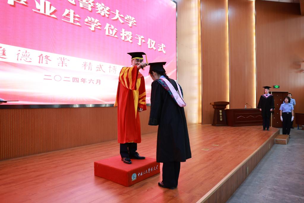 6月24日,警察大学2024届毕业生学位授予仪式在报告厅隆重举行。243名本科毕业生代表和188名硕士毕业生身着学位服参加仪式。校长马金旗、副校长刘义祥、潘清义、杜旭宇以及各学院领导、导师、教师代表、毕业中队干部出席了仪式。仪式由潘清义副校长主持。