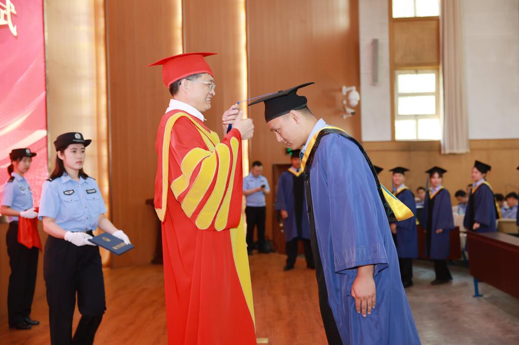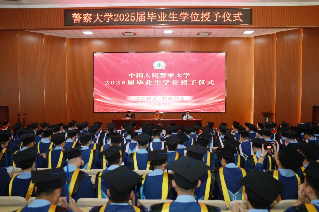 6月20日上午,警察大学2025届毕业生学位授予仪式在学术报告厅隆重举行。警察大学校长吴立志为获得硕士、学士学位的毕业生代表拨正流苏、颁发学位证书,副校长杜旭宇宣读了授予2025届2200余名毕业生学位的决定。校属有关单位负责同志、全体研究生导师、助理导师、本科任课教师代表,2025届研究生和本科生代表及亲友参加学位授予仪式,共同见证2025届学子圆满完成学业、开启人生新篇章的重要时刻,副校长潘清义主持学位授予仪式。