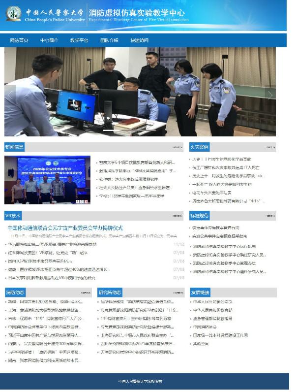 虚拟仿真实验教学中心网站首页主要内容包括新闻信息、火灾案例、VR技术、标准规范、消防动态、研究所动态、友情链接等。其中新闻信息主要展现中心举办会议、讲座,中心兴趣小组开展相关活动,中心教师外出调研、参会等活动;火灾案例模块主要展现的是新近发生的典型的火灾案例;VR技术主要展现的是虚拟仿真技术在消防及其他行业中的应用情况,VR技术的现状及相关理论等;消防动态、研究所动态,主要展现目前国家消防救援队伍、装备、科研等情况;标准规范主要展现的是中心的相关规章制度,教育部、河北省及学校与VR相关的制度规范等。通过以上内容,可以使读者在掌握新近发生的火灾案例、国家救援队伍建设现状、研究所科学研究内容的基础上,结合VR技术的标准规范,从消防救援队伍训练、案例研讨、科学研究等方面,开发与应急救援领域发展需求相适应的虚拟仿真资源,对消防救援队伍、国家应急救援机构等的发展具有一定的指导价值。