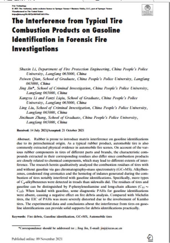 日前,由防火工程学院2021届李舒心同学撰写的《The Interference from Typical Tire Combustion Product on Gasoline Identification in Forensic Fire Investigation》在重要学术期刊《Fire Technology》上正式发表。这是学校在实现转型升级以来,首次由本科生作为第一作者,警察大学作为完成单位正式在国外重要期刊发表学术论文。此篇论文的成功发表,再次创造了学校本科人才培养质量的新高!
