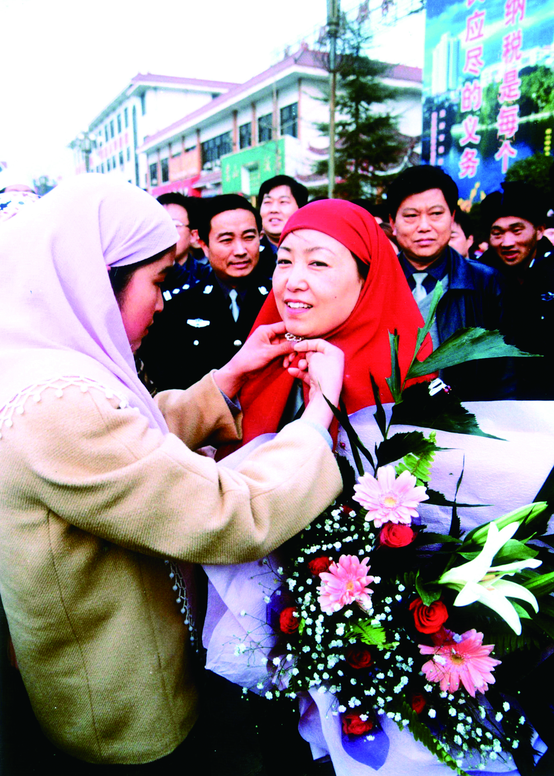 人潮涌动中,一位中年妇女手里拿着一条大红纱巾,径直走向任长霞,笑着将红纱巾系在她的脖子上。任长霞很开心,脸上泛起了红晕。她笑着问乡亲们:“今天我好看不好看?”说完甜蜜地笑着,面前的乡亲们也笑了……那一刻,她就像一个在父母跟前撒娇的乖女儿。