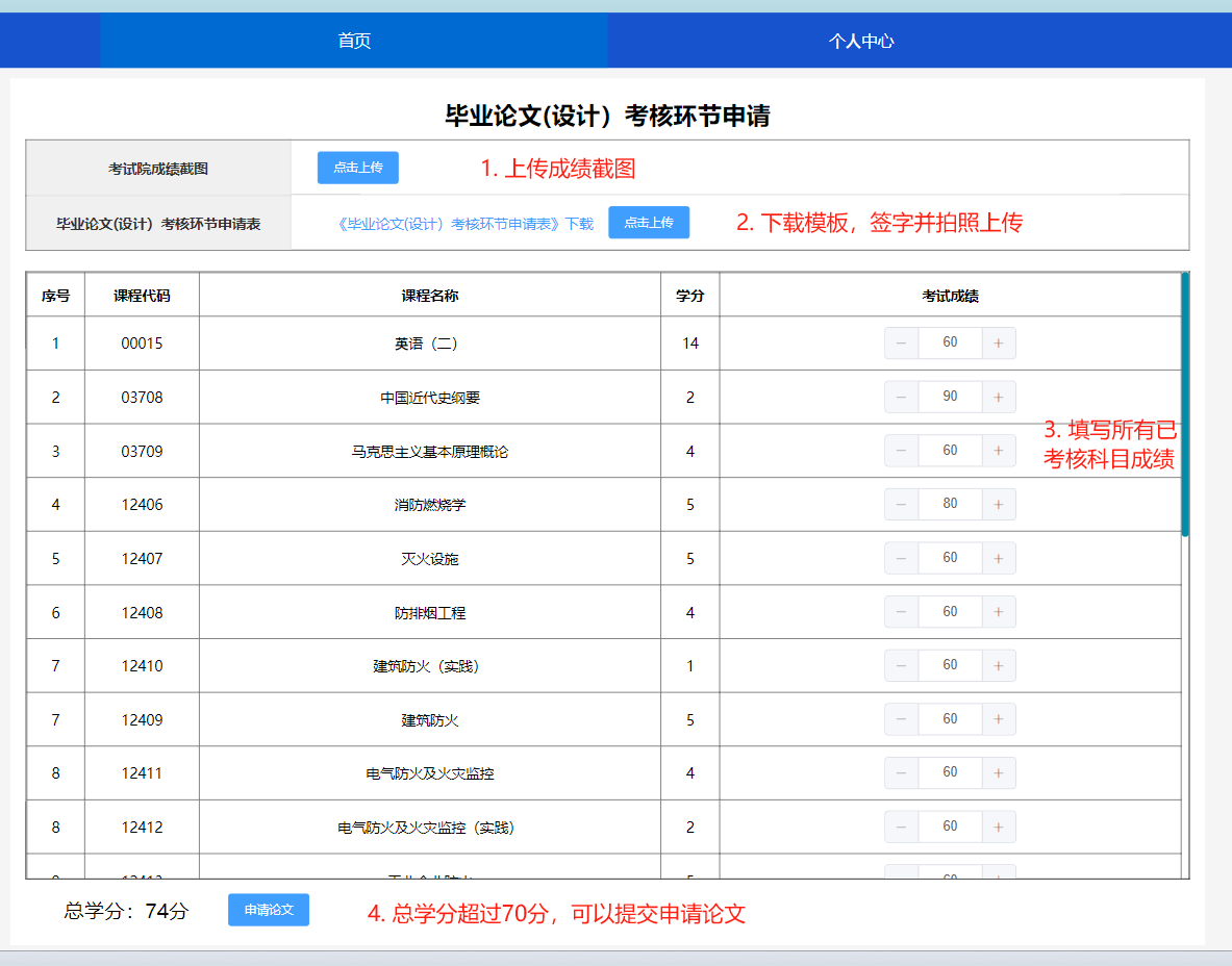 2、上传“毕业论文(设计)考核环节申请”和各省“教育考试院官网考试成绩截图”。(1)下载《毕业论文(设计)考核环节申请表,打印、签字并拍照,上传本人签字后的申请照片;(2)上传各省教育考试院各科成绩截图;(3)填写各科目的考试成绩,总学分达到70可以报名参加论文(设计)。