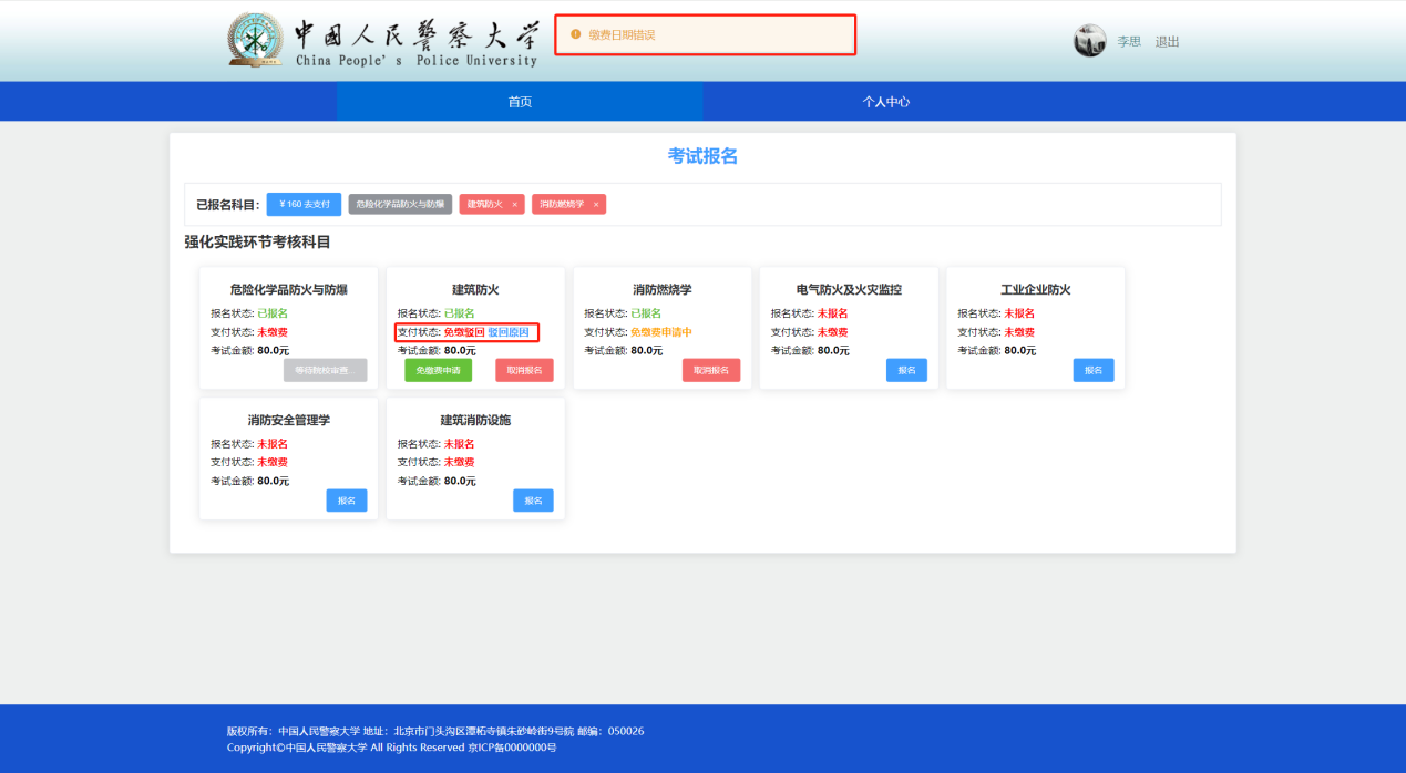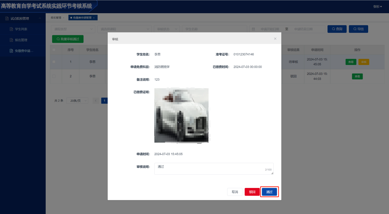免缴费报名管理功能:审核本校考生考试报名的免缴费申请。