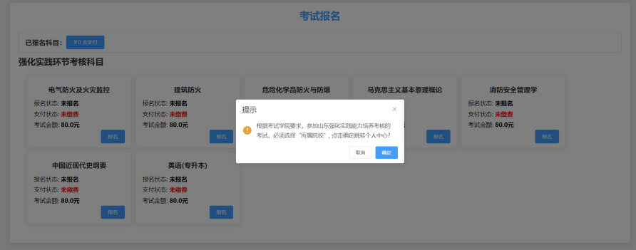 (1)点击去支付跳出弹窗,仔细阅读报名缴费说明,确认无误后点击上传报考科目