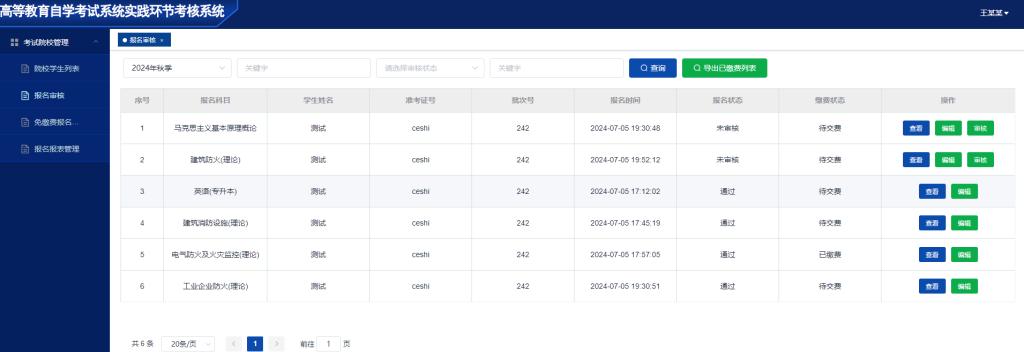 点击”审核“按钮,审核考生的考试报名申请(审核通过考生方可缴费)。