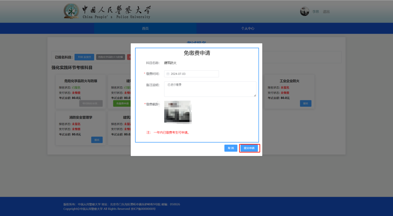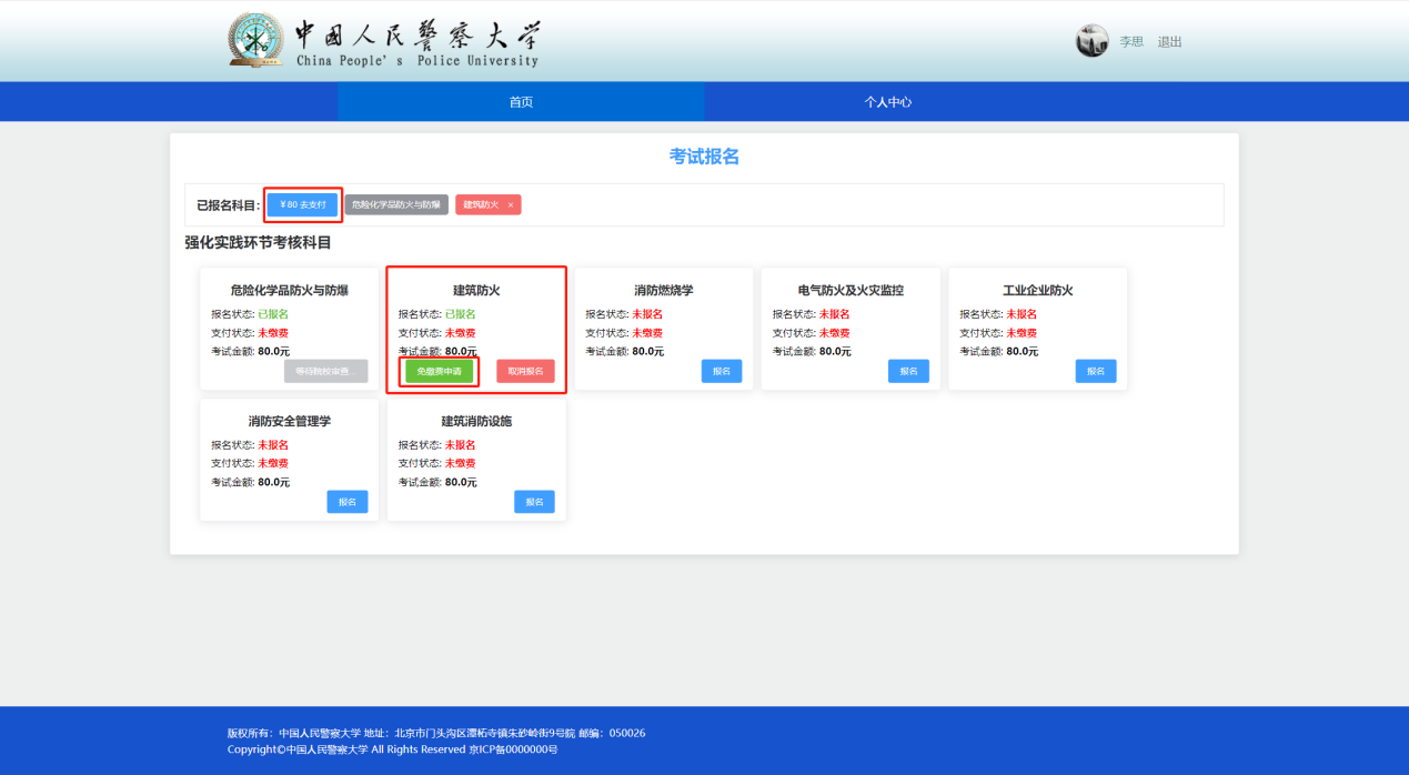 第一步、考生申请科目考试免缴费