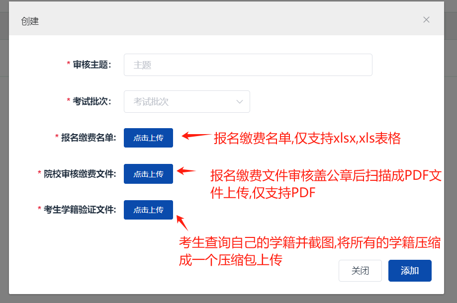 上传附件包括:导出的报名信息excel文档、试点院校盖章后的pdf扫描件、考生学信网学籍在线验证报告截屏图片zip打包文件;