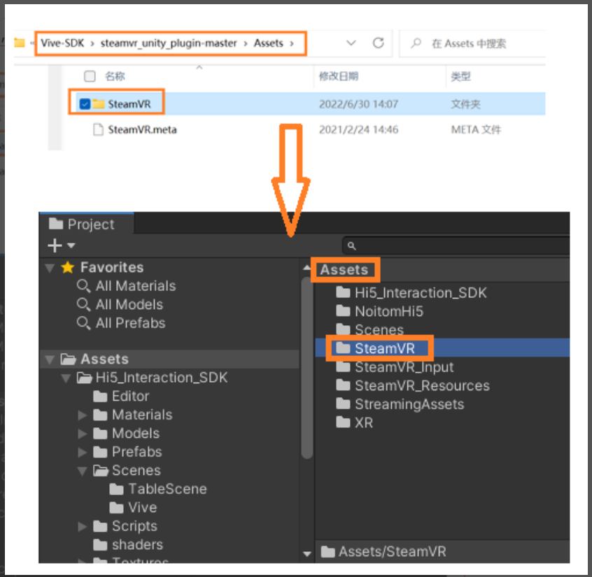 (1) 新建或打开 Unity 工程2) 打开插件文件夹,将 Assets 文件夹中 SteamVR 目录拷贝到 Unity 工程中的 Assets文件夹中,如图所示: