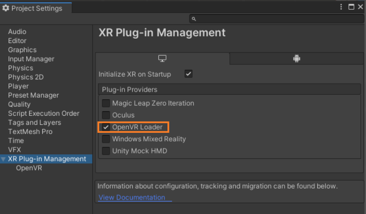 安装完成后会弹出 Project Settings,显是 OpenVR Loader 插件处于应用状态,表示插件安装成功,如图所示