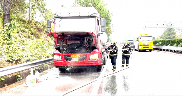 消防救援人员到达现场,发现起火车辆是一辆满载盐酸(30吨)的货车,货车车头发动机正处于燃烧状态,现场不断冒出焦煳刺鼻的浓烟,车头部分已经烧焦,现场无人员被困。根据现场情况,消防救援人员一边设置安全警戒标志,一边铺设水带设置水枪阵地,对车辆火势进行扑灭。由于车头发动机温度过高,为防止阴燃,消防救援人员继续使用水枪对货车车头内部进行冷却处理,确保车辆不会复燃后。17时46分,护送事故车辆下高速,随后返回。