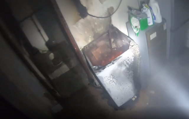 消防救援人员到达现场附近,由于巷子道路狭窄,消防车无法进入,救援人员手提救援器材步行进入现场。现场为宿舍楼3楼插座短路起火,引燃一旁的洗衣机、冰箱等家电。消防救援人员了解情况后,立即展开灭火,同时打开房间窗户进行散烟处理。几分钟后,火势得到了控制,所幸扑救及时,未造更大损失。随后,消防员将被烧毁的洗衣机抬至室外。