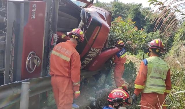 10月22日9时,赣州市会昌县晓龙乡469乡道一辆大货车撞向护栏发生侧翻,1人员被困。接警后,消防救援人员立即赶赴现场处置。