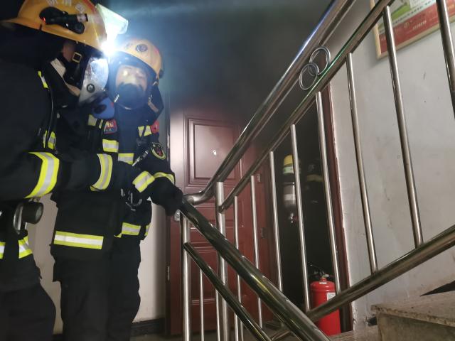消防队员到达现场后发现,着火点位于小区一楼栋二楼,滚滚浓烟不断从窗户往外冒出,烟雾冲出房间把楼道堵住,可见度低。