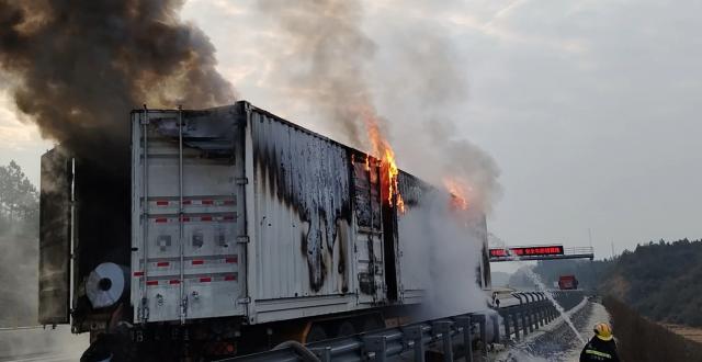 1月08日6时,吉安市万安县五丰镇大广高速南下方向2953公桩处一辆货车起火。接警后,消防救援人员立即赶赴现场。