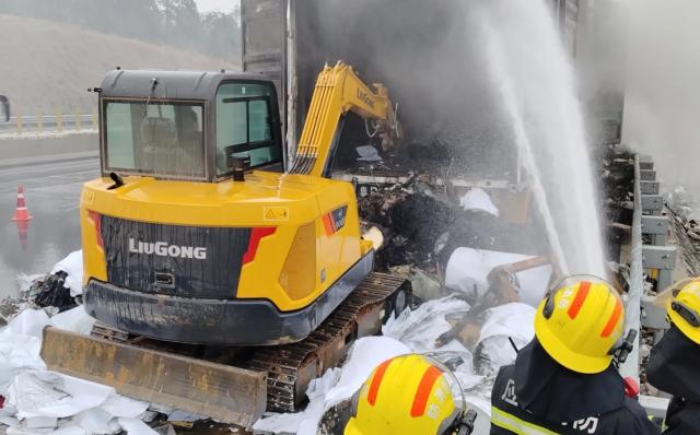 指挥员立即组织灭火小组出两支水枪对货车车厢进行控制蔓延,并用火钩在车尾把货物钩下,由于里面燃烧的都是厚重的货物且积压在车厢里,无法完全扑灭。现场指挥员立即协调安排挖机帮忙,在挖机的帮助下,消防员迅速把车厢里的余火清理干净。