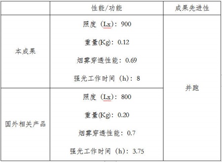 该成果依托部消防局应用创新计划项目《灭火救援个人照明技术研究》(项目编号:2012XFCX05),突破了消防照明灯具使用时间和寿命短、穿透黑烟能力差的技术难题,研究了浓烟环境下消防员照明灯具性能测试平台并提出产品应用设计需求,形成了相关测试技术和方法,研制了佩戴式照明灯,制定了产品性能指标要求,解决了目前我国消防员配备的照明灯,在实际应用中存在的穿透烟雾能力差、工作时间短、便携与防爆性不好等问题。