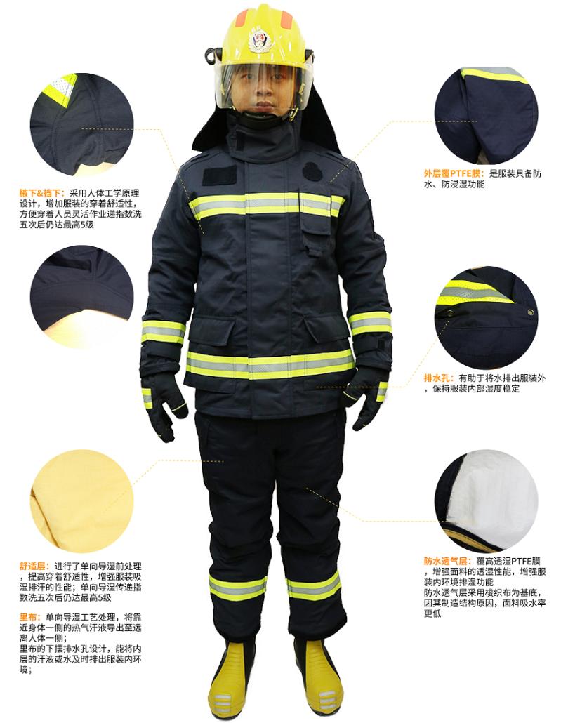 导湿抗浸型消防员灭火防护服在符合XF10-2014《消防员灭火防护服》行标所有参数要求,同时还具有抵抗浸湿以及导出汗渍的技术特点。该装备由内侧覆高透膜的外层、梭织布覆膜的防水透气层、单向导湿设计的舒适层组成。针对抗浸性能,外层内侧覆膜可以有效抵御外部喷水,同时防水透气层的基材从无纺布替换成了梭织布、进而有效减少了液体的吸收,进而大幅降低了装备因吸湿导致的中量增加。普通服装浸湿试验后吸湿增重1454%,新服装吸湿增重只有56%,即远低于普通服装的30%。针对导湿性能,舒适层进行了耐洗涤的持久单向导湿整理,其单向导湿传递指数O可达最高的5级,与皮肤接触的舒适层能够快速将汗渍导出到外部,同时设计了用于汗滴排出的排汗孔道,保证了皮肤的干爽。同时采用了高透膜设计,织物覆膜后的透湿率性能超过了8000g/(24h·m2),整体装备的湿阻参数为12.9m2·Pa/W满足了欧标EN469不高于30m2·Pa/W的要求、热损失参数为328.2W/m2满足了美标NFPA1971不低于205W/m2的要求,进而有力保障了消防员在南方等湿热环境下的安全舒适。