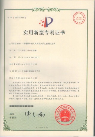该成果取得了一项 “一种地铁车辆火灾环境参数实验测试系统”(ZL 2016 2 0641855.7)实用新型专利。该标准实验测试系统及方法已被辽宁省地方标准DB21/T 2755-2017《城市轨道交通车辆火灾自动报警和细水雾灭火系统技术规程》采纳。