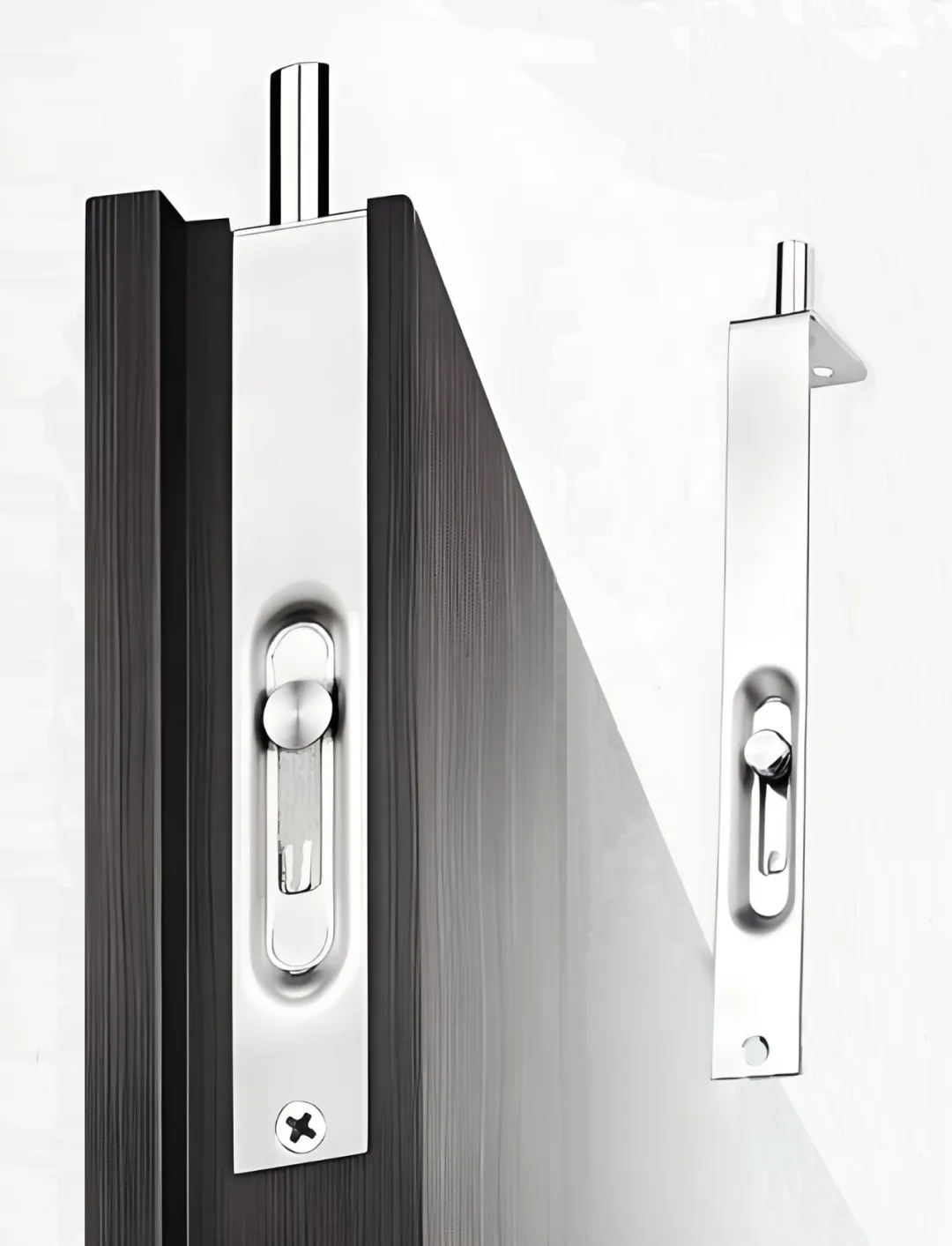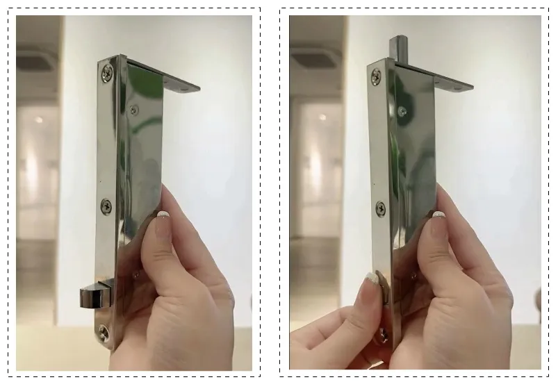 【图示6】手动插销(示意)(2)自动插销。自动插销的安装位置与手动插销相同。相对于手动插销,自动插销用锁舌替代手动推杆。当另一侧门扇关闭时,推入锁舌,锁舌连锁推出插销,锁定门扇;当另一侧门扇打开时,锁舌在自身弹簧作用下伸出,连锁收纳插销,解锁门扇【图示7】。具体功能,参见视频分解。