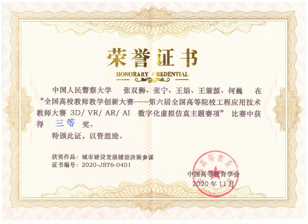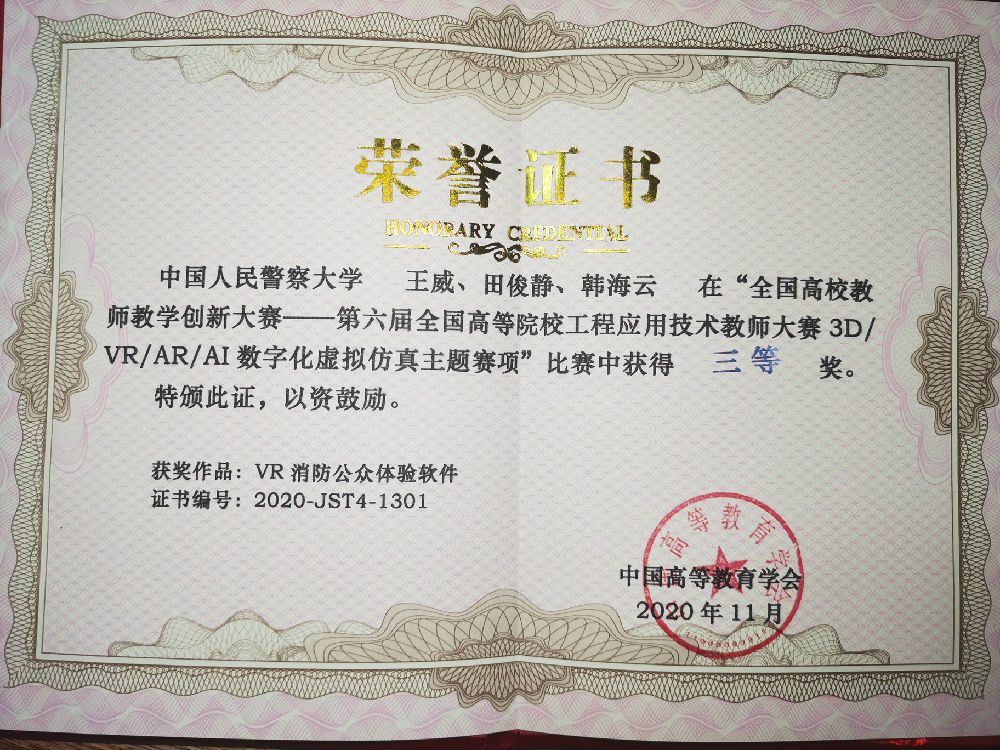 11月10日,由中国高等教育学会主办的全国高校教师教学创新大赛——第六届全国高等院校工程应用技术教师大赛-3D/VR/AR数字化虚拟仿真主题比赛颁奖典礼在长沙举行。本次大赛共吸引全国30个省,238所院校,445个团队报名,通过前期的校赛选拔和省赛评审,最终240支团队进入此次全国总决赛,96个团队获奖。我校救援指挥学院汤华清、王铁、李驰原等老师提交的作品《高层建筑火灾扑救模拟训练》获二等奖,智慧警务学院王威、田俊静及防火工程学院韩海云老师的作品《VR消防公众体验软件》以及智慧警务学院张双狮、王娟、王策源等老师的作品《城市建设发展辅助决策参谋》分别获三等奖。