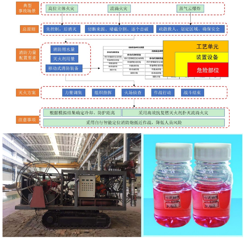 2、提出了石油化工工艺装置火灾典型事故场景的灭火救援力量配置要求,制订了典型事故场景下在危险部位—装置设备—工艺单元等不同层级需要采取的灭火救援技战术组合方案,将灭火救援与工艺控制措施相结合提出了火灾事故的预防措施建议;