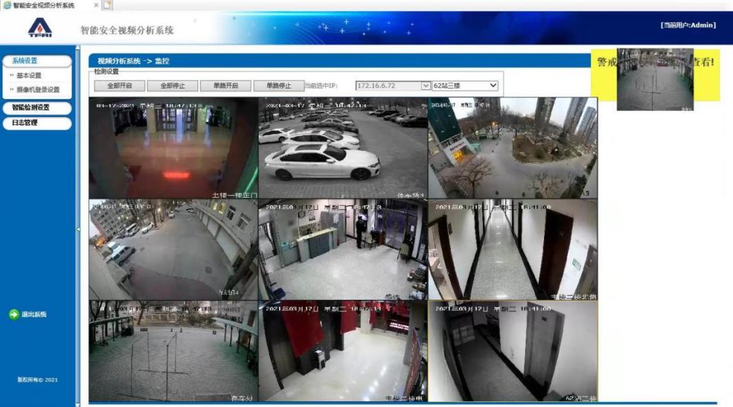 不改变已有的视频监控网络架构,通过外接计算设备使监控摄像头具备智能性,克服了监控画面光照变化强烈、物体遮挡情况较多、雨雪天气影响等干扰问题,功能覆盖消防通道占用检测、消控室人员工作状态检测、重点人员身份识别、烟雾及火焰检测、消防栓倾倒与流水检测、行人异常行为检测、电动自行车等受控物品检测和受控区域人员进出检测都进行了设计,基本覆盖日常消防管理的各个方面,并且在测试中表现出报警准确且快速的特点,填补大部分市售智能分析系统的功能空白。适用于九小场所、社区以及部分文保单位。