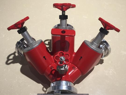 消防部队常用的消防分水器结构采用球阀型和手轮型开闭结构,在实战高层垂直供水时,球阀型会由于灭火剂本身自重、供水压力等因素影响,在灭火需要泄压时,出现分水器阀门无法顺利打开,甚至需要消防队员现场砍断水带方能顺利泄压;手轮型消防分水器采用的是80/65-65-65的三分水结构,供水时还需要留出一支作为泄压口使用,且重量也较重。新型泄压型消防分水器采用了新型手轮结构,并设置备用泄压口,泄压均匀快速,并可三只分水口同时使用,出口分布形式采用80/65-80-65的三分水结构形式,结构合理,最大程度完善了水力性能,降低局部阻力损失。