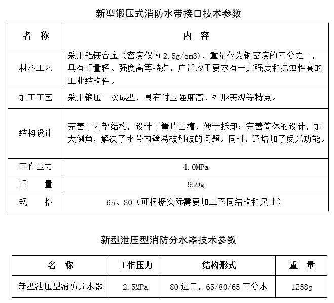 针对现有消防水带接口由于缩孔、缩松、裂纹等铸造、加工缺陷等导致的水带接口质量不可靠、耐压程度不高、转换接头过多等的问题,采取新型工艺和材料,公安部上海消防研究所研制出新型锻压式铝镁合金消防水带接口,为消防部队提供轻质、高强度的消防接口,工作压力可达4.0MPa,有效避免高压供水时水带接口耐压程度不够、接口过重等的问题。