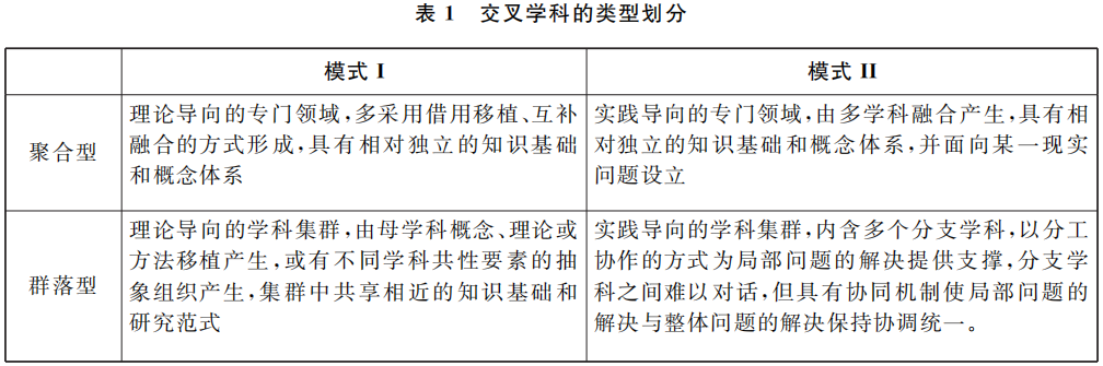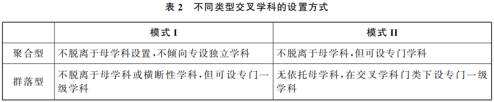 交叉学科是学科交叉形成的理论体系。按照不同的知识生产模式和知识交叉方式,可分为模式I—聚合型交叉学科、模式I—群落型交叉学科、模式II—聚合型交叉学科、模式II—群落型交叉学科。模式I—聚合型交叉学科一般不单设门类或一级学科,设为一级学科下二级学科,模式II—群落型交叉学科一般在交叉学科门类设一级学科,其他两种类型的交叉学科依托与知识基础关联的学科门类下设一级学科或二级学科。